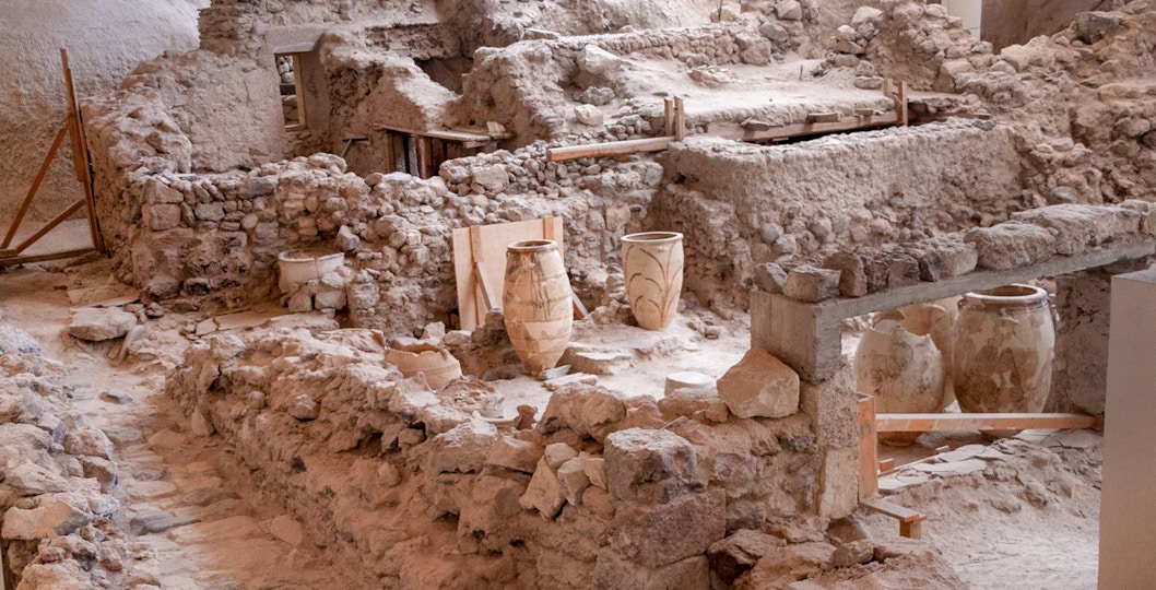 Marchez à travers les ruines d'Akrotiri préservées des cendres et explorez la vieille ville de Fira avec un audioguide immersif.